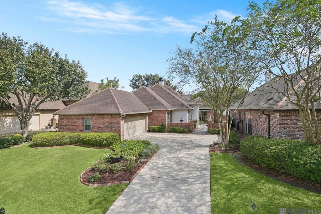 Gorgeous 3 bedroom 2.5 bath home in highly desirable golf course community of Santa Maria Subdivision. New architectural shingled roof and gutters are less than 2 months old! Updated upscale lighting! Beautiful front courtyard with slate flooring, beautiful brick fencing and statement fountain with new pump. Step inside and take in this spacious open floor planned living and dining room featuring reclaimed heart of pine flooring, 12+ ceilings with triple crown molding, reclaimed cypress beams, and feature wall of built-in cabinetry and gorgeous fireplace. Gourmet kitchen featuring Jenn Air gas cooktop, wall oven, center island and huge pantry. Custom cypress cabinetry gives classic style and great storage. Breakfast area is spacious and has feature window overlooking front courtyard and fountain. Primary suite is a luxury retreat with heart of pine flooring continuing in bedroom. Great sitting area is located in front of large window overlooking lush, low maintenance private backyard courtyard. En-suite bathroom is spacious and features custom shower, separate jetted tub, premium cabinetry dual vanities with great storage and private water closet. Huge walk-in closet!! Primary bedroom is split from 2nd and 3rd bedrooms, offering greater privacy. Both 2nd and 3rd bedrooms are spacious and have great storage. Back courtyard is partially covered and open area has beautiful shade tree making this a lovely retreat year round! Utility room is spacious with great storage and sink. Convenient half bath off kitchen and laundry area. Extra deep 2 car garage. Subdivision features include: golf course community, numerous park open areas, playground, tennis courts, boat launch into navigable water, charming chapel with huge live oaks, sidewalks, curb and gutter, street lights, active HOA with crawfish boils, Octoberfest, holiday activities and more! Convenient to I-10, great shopping and restaurants.