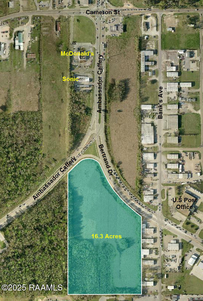 16.3 acres at intersection of Ambassador Caffery Pkwy & Bertrand Drive forming a ''Y''. Rear access via Luke Street. Zoned Commercial Heavy.